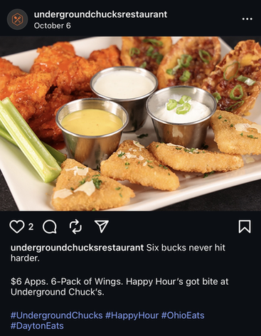 To drive engagement from day one, I focused on crafting a distinctive voice and storytelling approach that captured Chuck’s edgy, underground tone while still appealing to a broad audience. I created posts that highlighted the restaurant’s signature items, promoted limited-time events, and set the foundation for future campaigns. The result was a cohesive and eye-catching launch that successfully positioned Underground Chuck’s as a standout brand within the Restaurant Growth Services family.